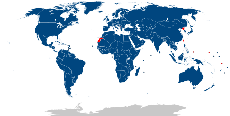 Karte der Mitgliedsstaaten von Interpol, Stand 2018; blau: Mitglieder, rot: Nicht-Mitglieder