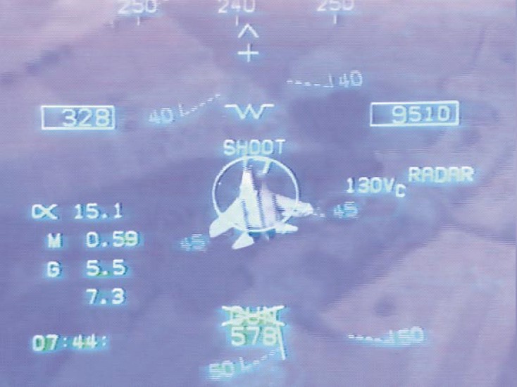 HUD-Ansicht eines Übungsluftkampfes zwischen einer F/A-18 und einer MiG-29 (Symbolbild)