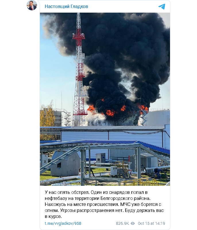 Zurück zu Gouverneur Gladkow: Ein von den Streitkräften der Ukraine abgefeuertes Geschoss traf ein Öldepot im Bezirk Belgorod