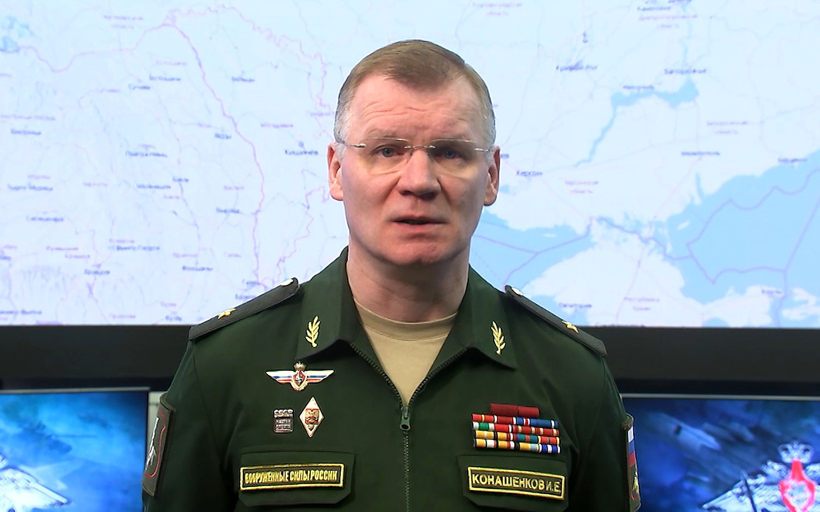 Der Pressesprecher des russischen Verteidigungsministeriums, Generalmajor Igor Konaschenkow, bei einem Briefing in Moskau