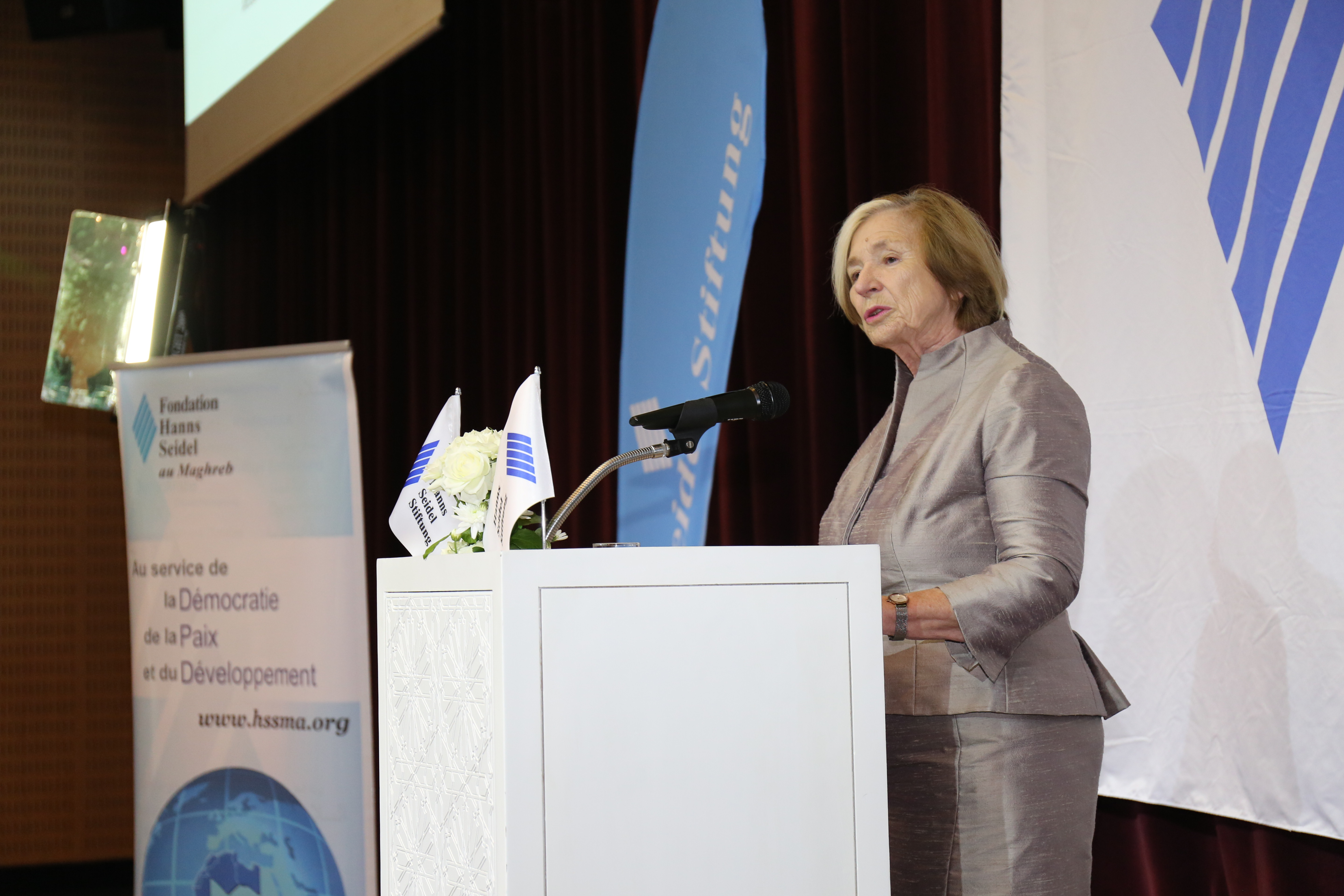 Stiftungsvorsitzende Ursula Männle begrüßt die internationalen Gäste beim Festakt in Marrakesch. Bild: "obs/Hanns-Seidel-Stiftung/HSS"