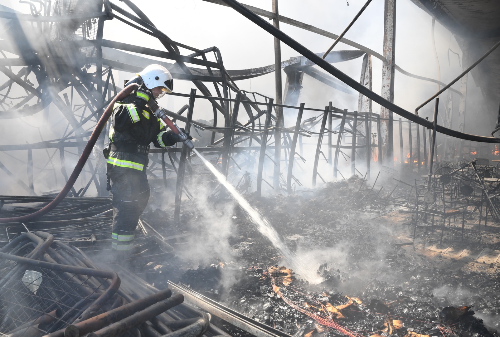 Ein Donezker Feuerwehrmann beim Löschen eines Brandes, der im Einkaufszentrum "Galaktika" durch ukrainschen Beschuss verursacht wurde, Aufnahme vom 24. August. Bild: Ilja Pitalew / Sputnik