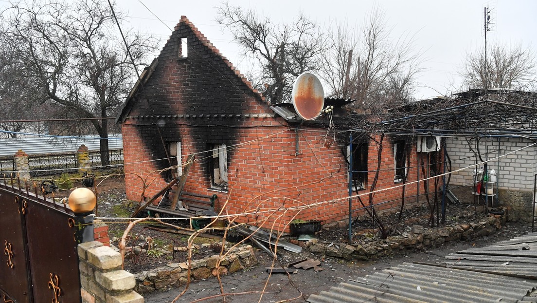 Ein zerstörtes Wohnhaus im Dorf Nikolajewka in der Volksrepublik Donezk.