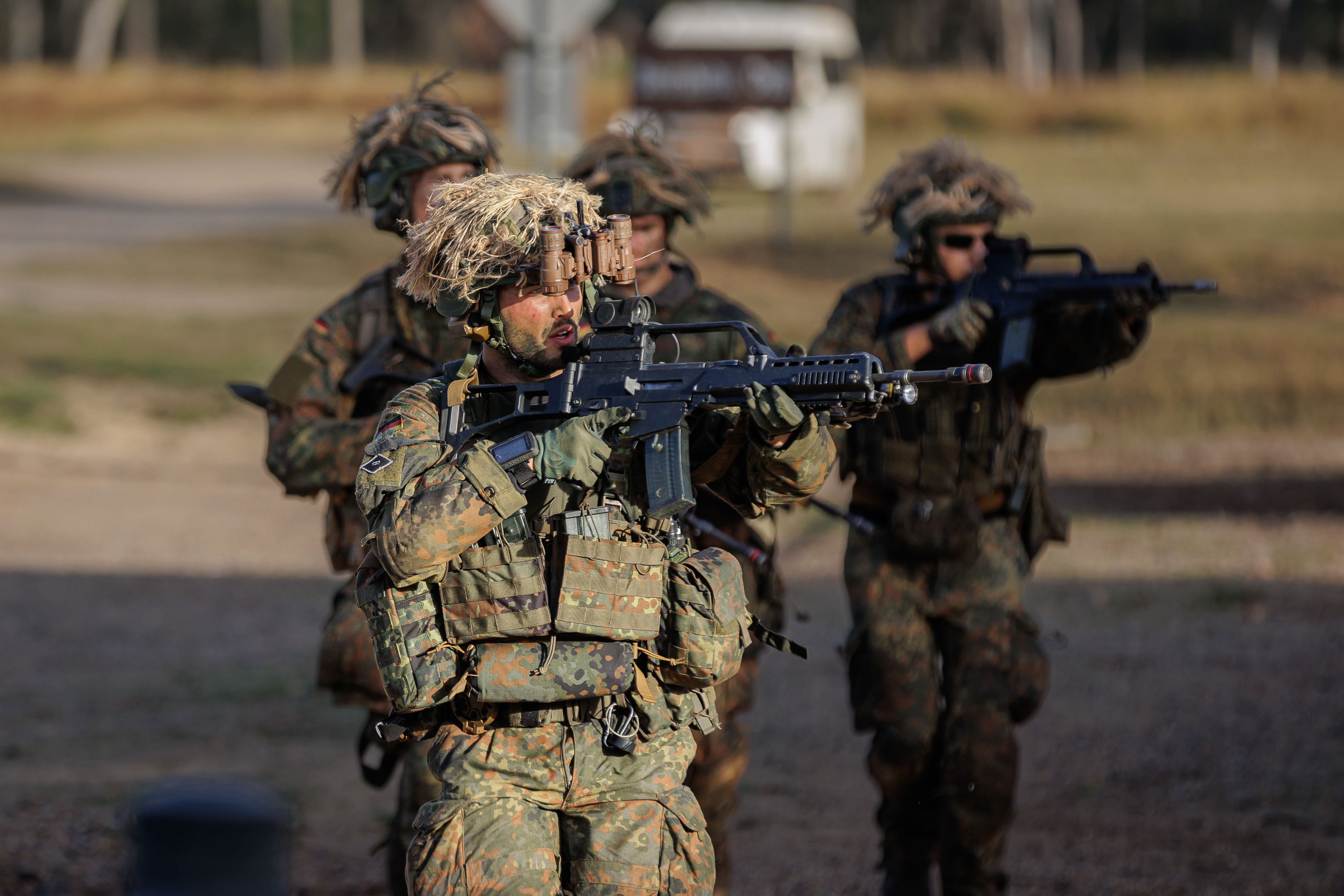 In kleinen Trupps gehen die Soldaten vom Fallschirmjägerregiment 26 bei ihrem Angriff vor / Weiterer Text über ots und www.presseportal.de/nr/127975 / Die Verwendung dieses Bildes für redaktionelle Zwecke ist unter Beachtung aller mitgeteilten Nutzungsbedingungen zulässig und dann auch honorarfrei. Veröffentlichung ausschließlich mit Bildrechte-Hinweis. Bildrechte: Bundeswehr/Marco Dorow Fotograf: Marco Dorow
