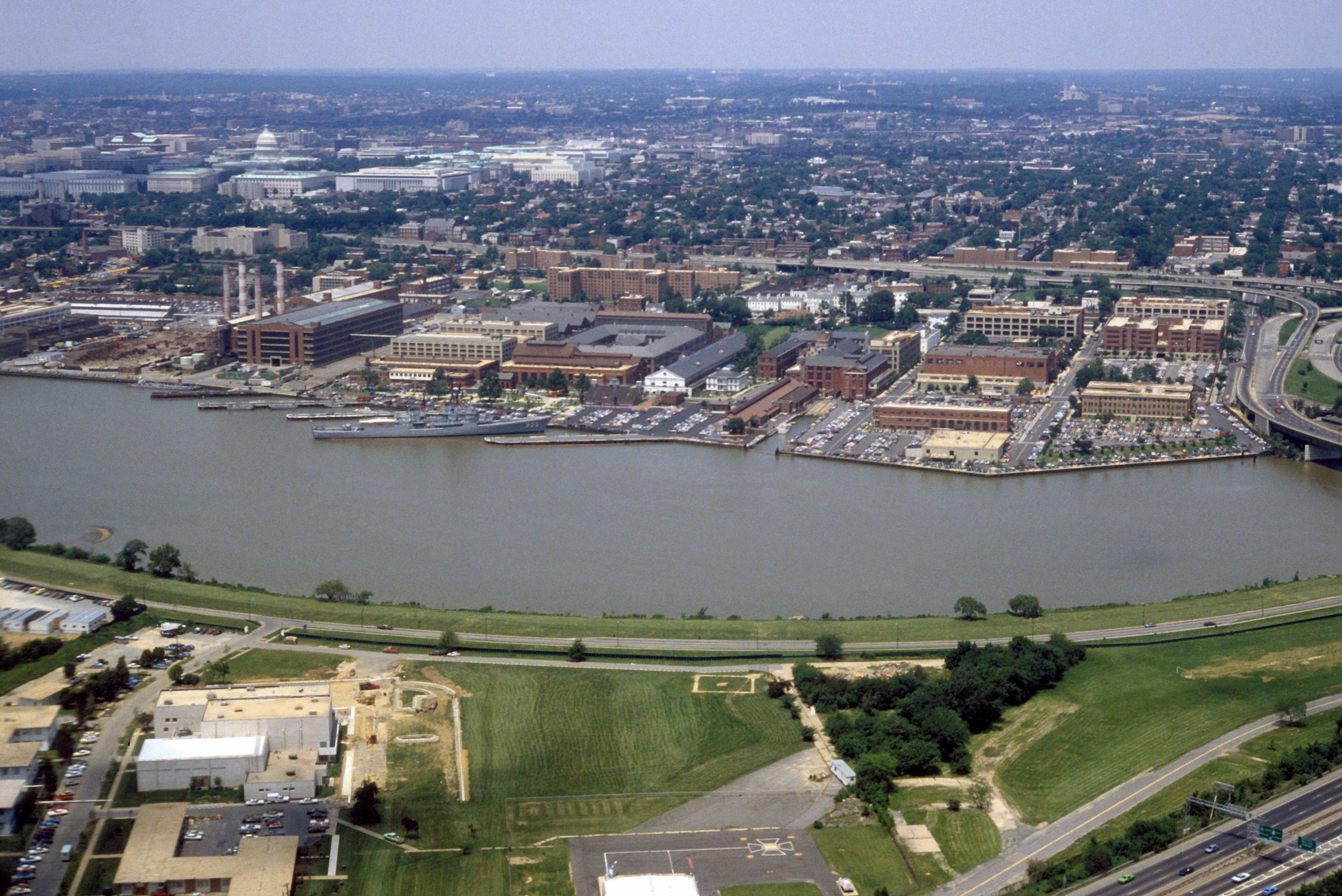 Luftaufnahme des Washington Navy Yard mit der USS Barry am Pier, im Hintergrund das Kapitol