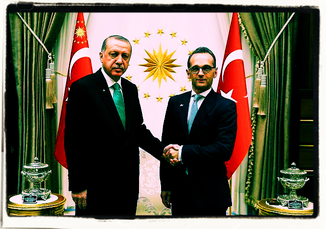 Heiko Maas läßt sich als beim türkischen Treffen, als Vertreter der Bundesrepublik Deutschland mit der türkischen Fahne repräsentieren (2019)