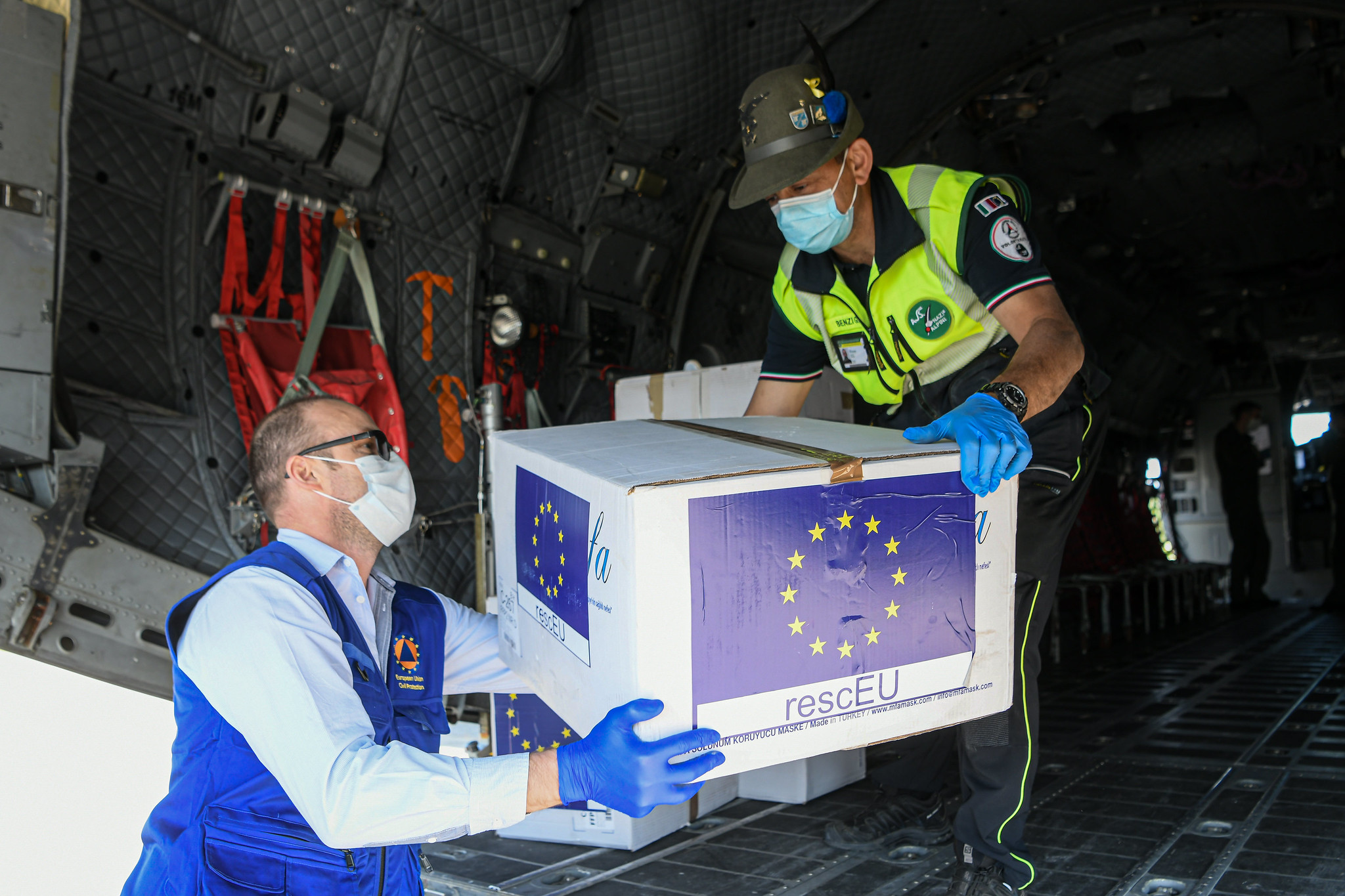 Ein Militärflugzeug bringt während der Corona-Pandemie am 25. April 2020 Schutzmasken aus Bukarest nach Mailand, als Teil der Operation rescEU. Bild"obs/Johanniter Unfall Hilfe e.V./Piero Cruciatti"