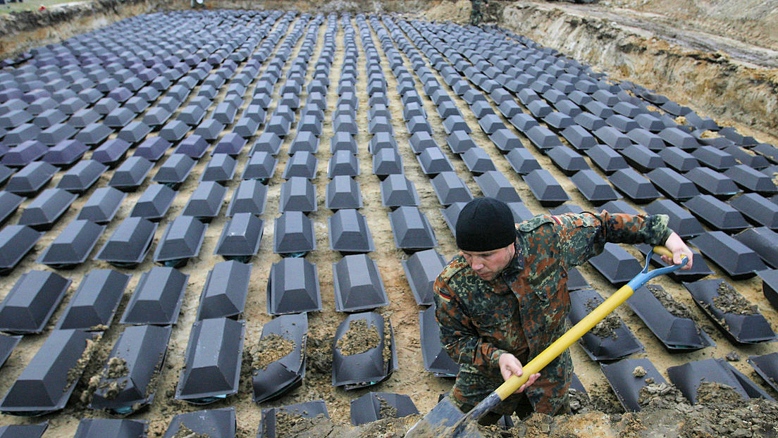 Mitglieds im Volksbund Deutsche Kriegsgräberfürsorge bei der Neubestattung deutscher Soldaten, die im Großen Vaterländischen Krieg bei Schtschatkowo in Weißrussland fielen. (9. November 2010) Bild: Sputnik © Jegor Jerjomow