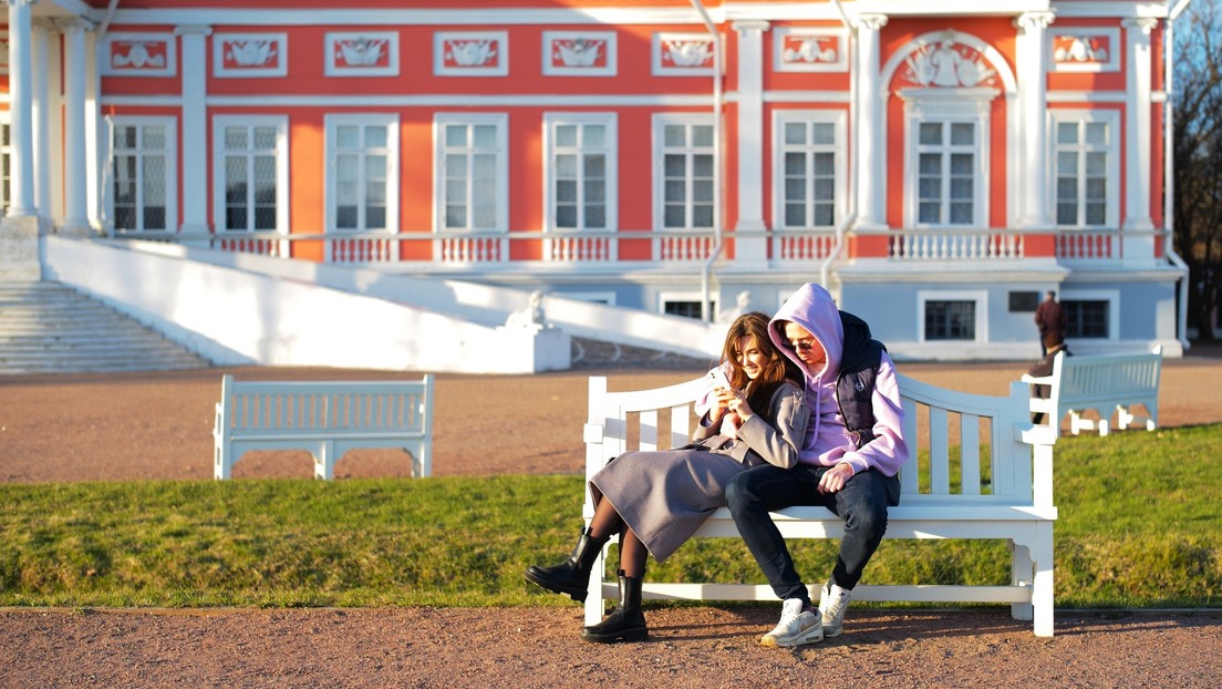 Auf dem Bild: Ein Paar sitzt auf einer Bank im Schlosspark Kuskowo in Moskau, 20. April 2022.