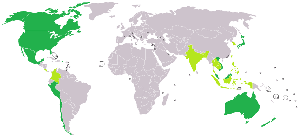 Transpazifischen Partnerschaft (TPP): Dunkelgrün: Haben im Oktober 2015 die Verhandlungen erfolgreich abgeschlossen Hellgrün: Haben Beitrittsinteresse bekundet (Stand: 2013)
