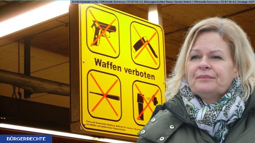 Bild: Schild: Sebastian scha. / Wikimedia Commons / CC BY-SA 3.0; Bild zugeschnitten Faeser: Sandro Halank / Wikimedia Commons / CC BY-SA 4.0; Montage: AUF1 / Eigenes Werk