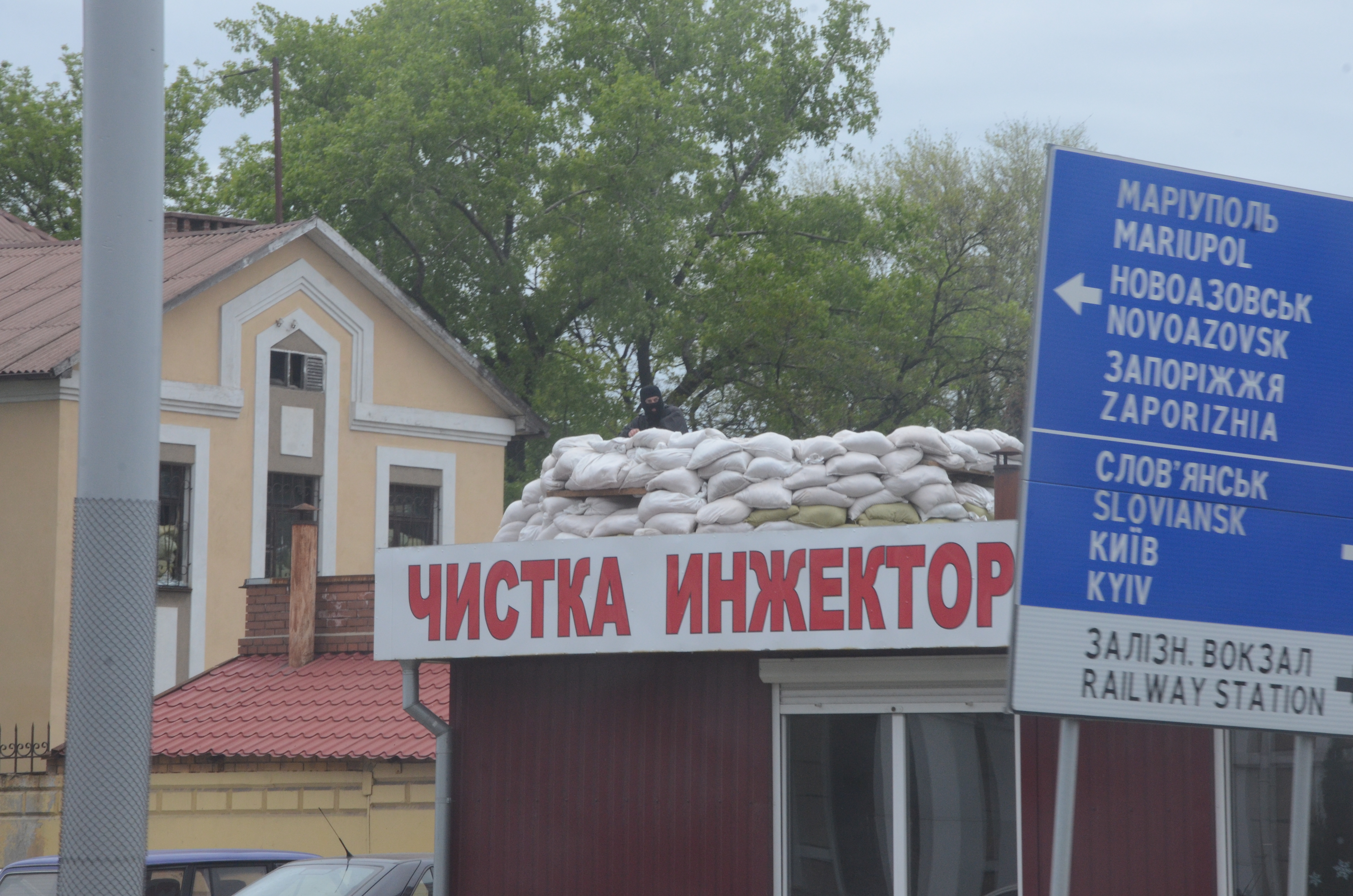 Insurgent emplacement in Donetsk, also showing a road sign that points to major conflict areas: Sloviansk and Mariupol.