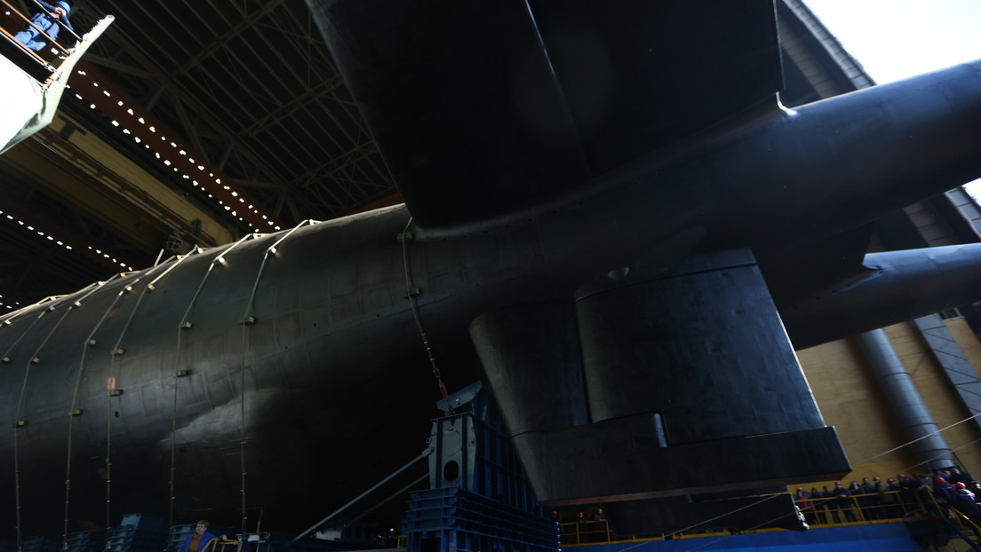 Das U-Boot K-329 "Belgorod" bei seinem endgültigen Stapellauf am 23. April 2019