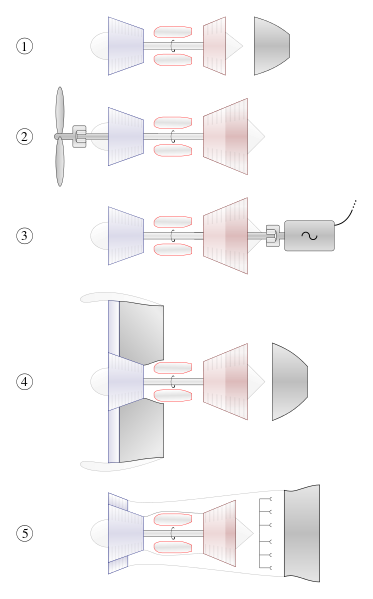 Beispiele für die verschiedenen Ausführungen einer Gasturbine: (1) Turbojet, (2) Turboprop, (3) Wellenleistungstriebwerk (hier mit elektrischem Generator), (4) Mantelstromtriebwerk (Turbofan), hohes Bypassverhältnis, (5) Mantelstromtriebwerk (mit Nachbrenner), niedriges BypassverhältnisHierbei kennzeichnen blau = Verdichter; rot = Turbine; grau = Schubdüse