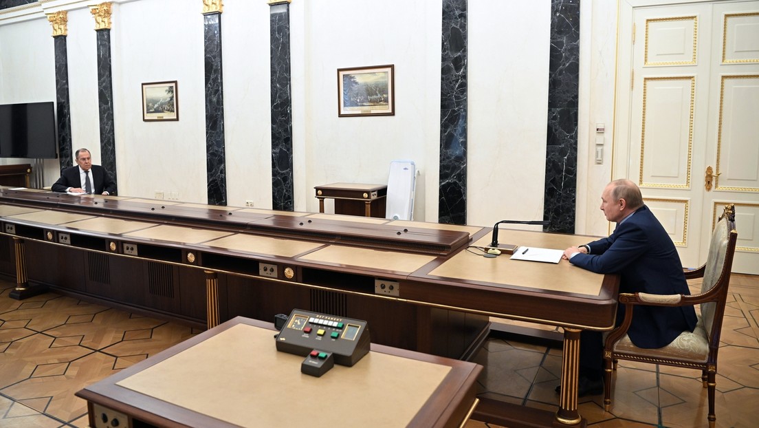 14. Februar 2022: Der russische Präsident Wladimir Putin mit Außenminister Sergei Lawrow (links) bei einem Treffen im Kreml.