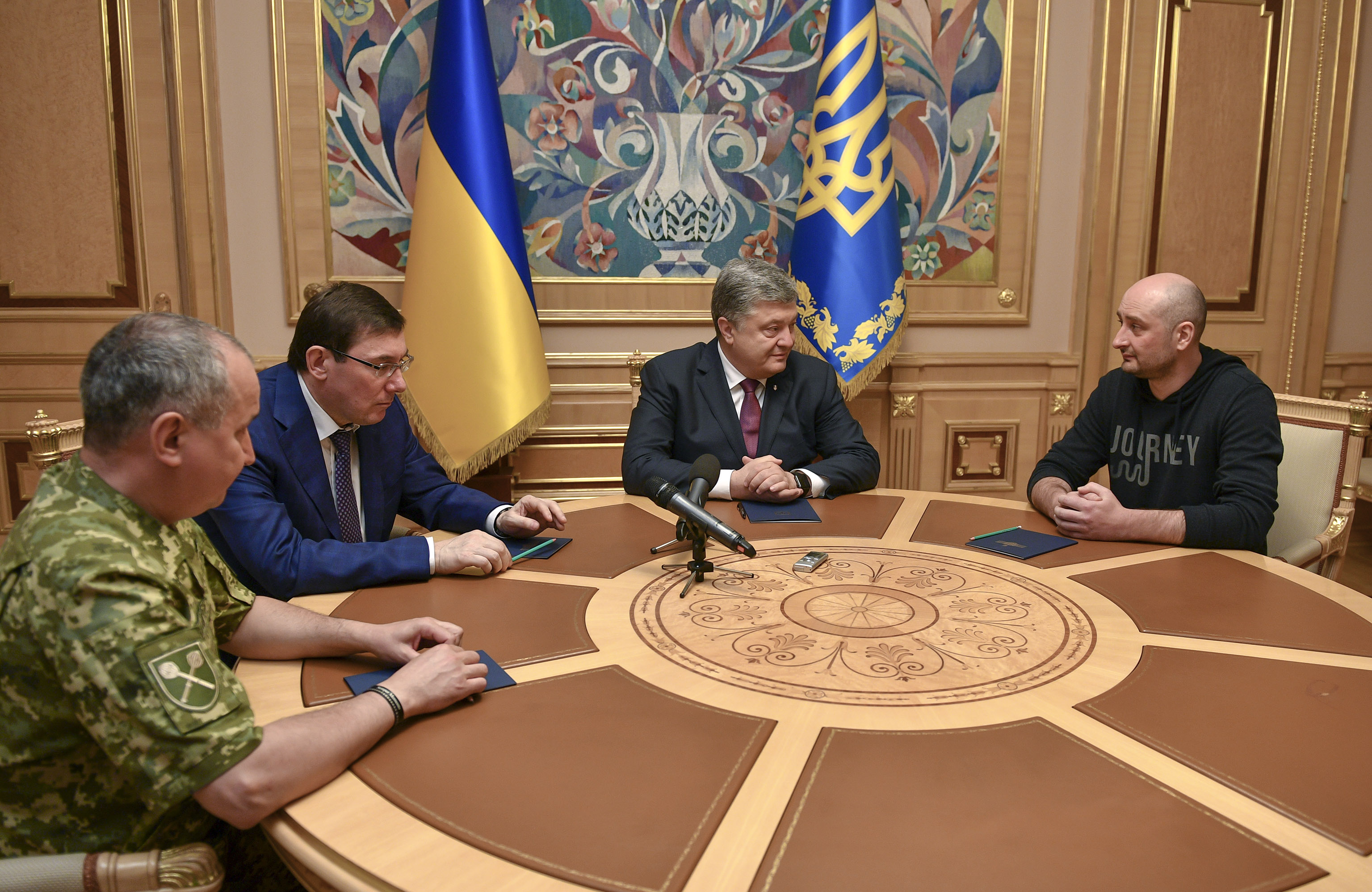 Babtschenko (rechts) mit dem ukrainischen Machthaber Petro Poroschenko (Mitte), dem Geheimdienstchef Wassyl Hryzak (links) und dem Generalstaatsanwalt Jurij Luzenko (rechts daneben) am 30. Mai 2018