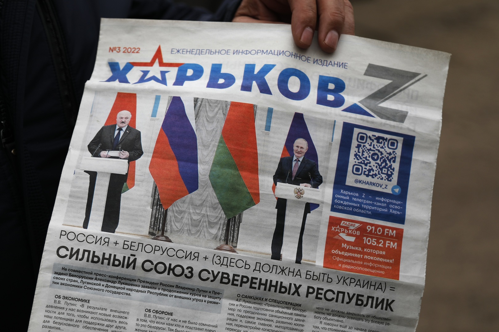 Archivbild: Ein Mann hält eine Nummer der Wochenzeitung "Charkow Z", 22. April 2022. Bild: TAISSIJA LISKOWEZ / Sputnik