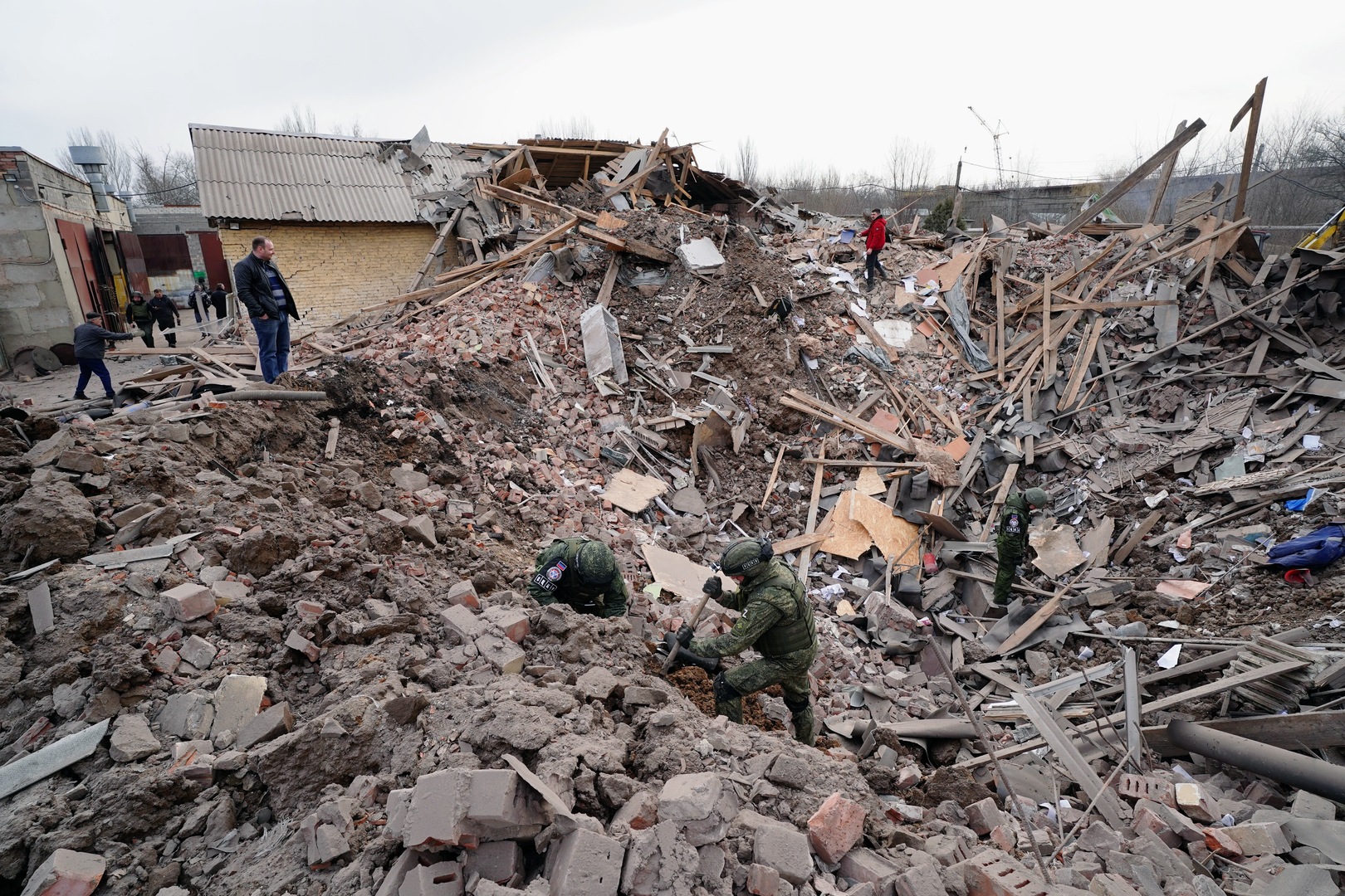 Folgen des Einschlags einer ukrainischen Totschka-U-Rakete in ein Gebäude des Wasserversorgungs- und Abwasserentsorgungsbetriebs im Petrowski-Stadtkreis in Donezk, 22. März 2023 Bild: Sergei Baturin / Sputnik
