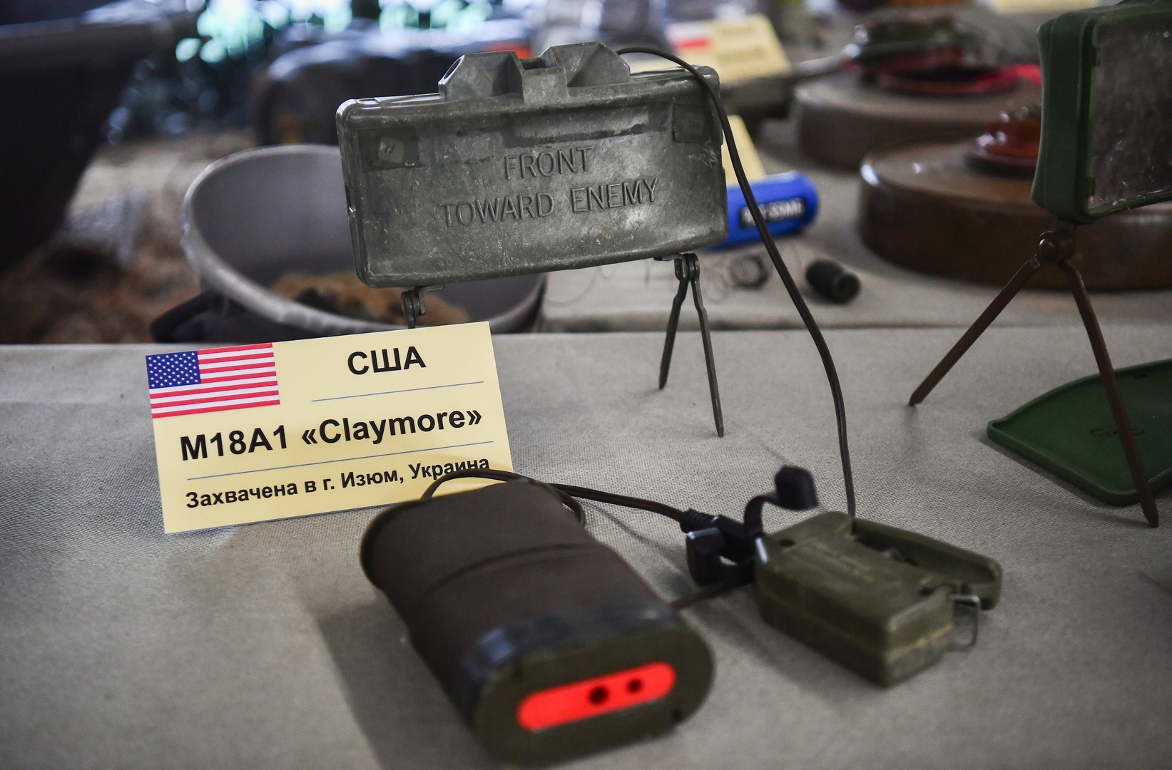 Antipersonen-Mine M18A1 Claymore aus US-Fertigung. Erbeutet in Isjum im Laufe der russischen militärischen Sonderoperation in der Ukraine. Ausstellung im Rahmen des militär-technischen Forums "Armee-2022" im Park Patriot, bei Kubinka, Gebiet Moskau. 08. August 2022. Bild: Jewgeni Bijatow / Sputnik