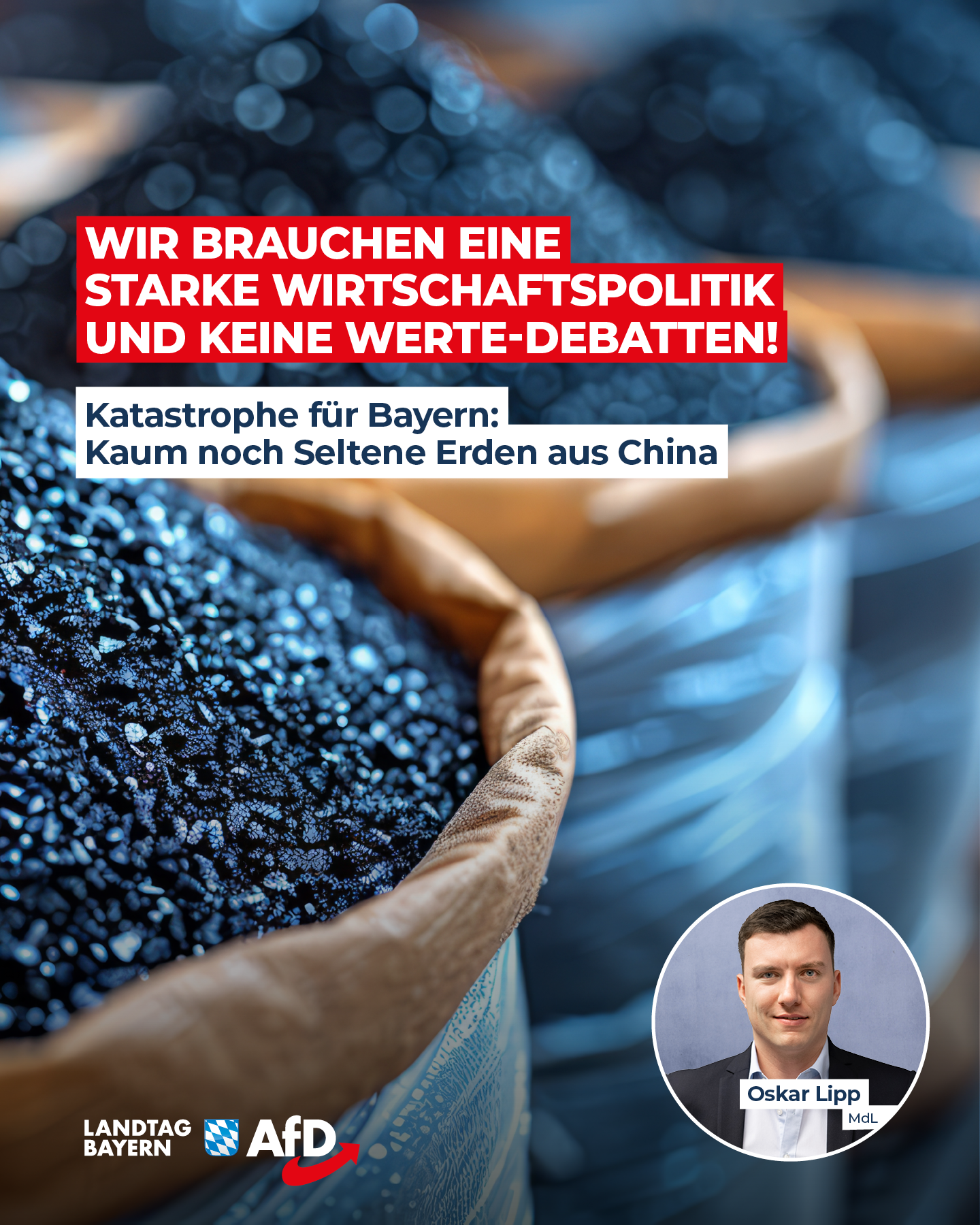 Zurück zu Oskar Lipp: Katastrophe für Bayern: Kaum noch Seltene Erden aus China – Wir brauchen eine starke Wirtschaftspolitik und keine Werte-Debatten!