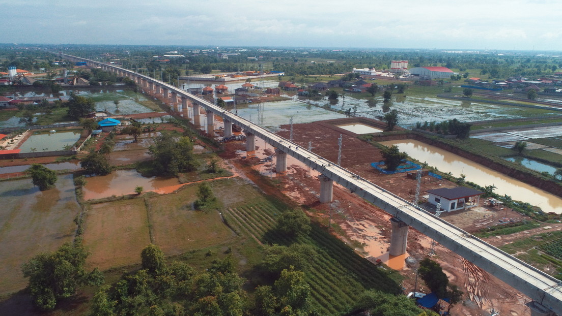 Eine Luftaufnahme vom 15. Juni 2021 zeigt die noch im Bau befindliche Phon Thong-Brücke in Vientiane, Laos.