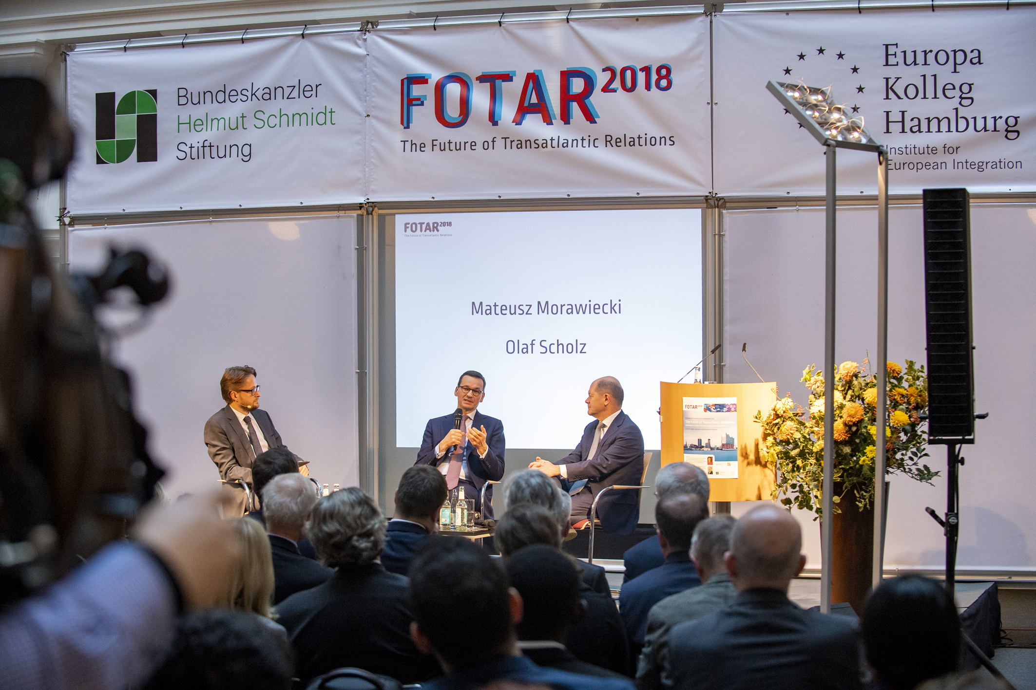 Dr. Heinrich Wefing (Die Zeit) interviewt den Ministerpräsidenten Polens Mateusz Morawiecki und den deutschen Vizekanzler Olaf Scholz (von links nach rechts). Bild: "obs/Bundeskanzler-Helmut-Schmidt-Stiftung/Bente Stachowske"