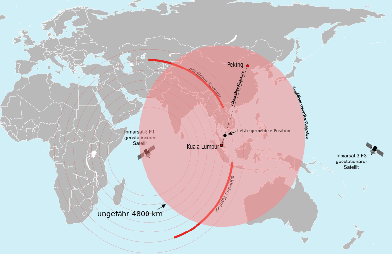 Aufgrund des Treibstoffvorrats (rote Fläche) und der vom Satelliten empfangenen Triebwerksdaten (rote Linien) theoretisch mögliches Gebiet, in dem sich MH370 befinden könnte (Stand: 18. März 2014). Das letzte durch einen Satelliten stündlich empfangene Signal um 8:11 Uhr MYT (00:11 Uhr UTC) am 8. März 2014 kam aus einem der beiden sichelförmigen „Korridore“ entlang der beiden roten Linien. Der nördliche Korridor beginnt etwa an der Nordgrenze von Vietnam bzw. Laos und geht in einem Bogen (äquidistant zum Satelliten) über Tibet und Kirgistan bis Kasachstan, der südliche beginnt etwa auf der Insel Java und geht bogenförmig in den Südindik hinein. Das Flugzeug ist vermutlich innerhalb einer Stunde nach jenem Zeitpunkt des letzten Empfangs entweder gelandet oder abgestürzt; falls es sich noch in der Luft befand möglicherweise aufgrund Treibstoffmangels. Der angegebene Punkt der „letzten gemeldeten Position“ war die Abmeldung bei der Flugüberwachung (bei Abschalten des Transponders); es wurde später durch militärisches Radar über der Straße von Malakka geortet.