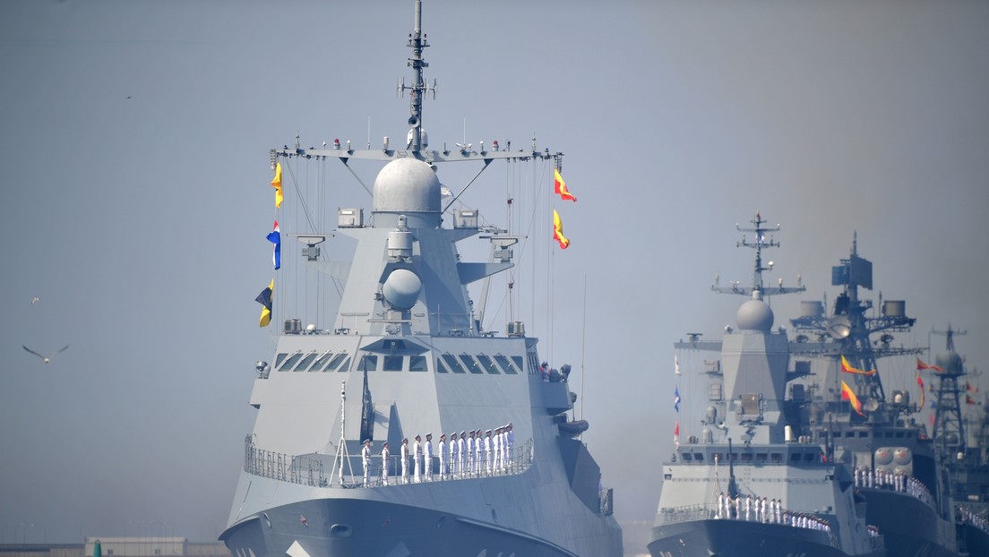 Schiffe der Schwarzmeerflotte bei der Übung für die Marineparade in Kronstadt, 19.07.2020; zweites Schiff von links die Stoykiy