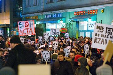 Anti-ACTA-Protestaktion in Sosnowiec (Polen): Guy-Fawkes-Maske, Symbol der Anonymous-Bewegung. Bild: MannfürsGrobe / wikipedia.org