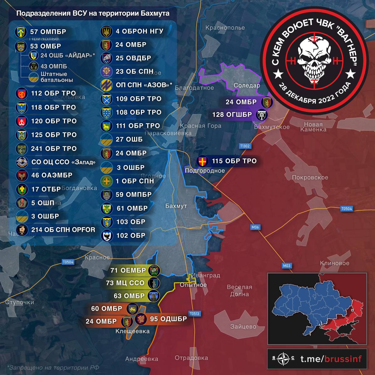 Grafik: Allein in Artjomowsk selbst stehen dem PMC "Wagner-Gruppe" zwei ukrainische Regimenter und 16 Brigaden gegenüber, mit den Landwehren sogar 22 Brigaden. 28. Dezember 2022 Bild: Brjusselski Swjasnoj (https://t.me/brussinf/5444) / RT