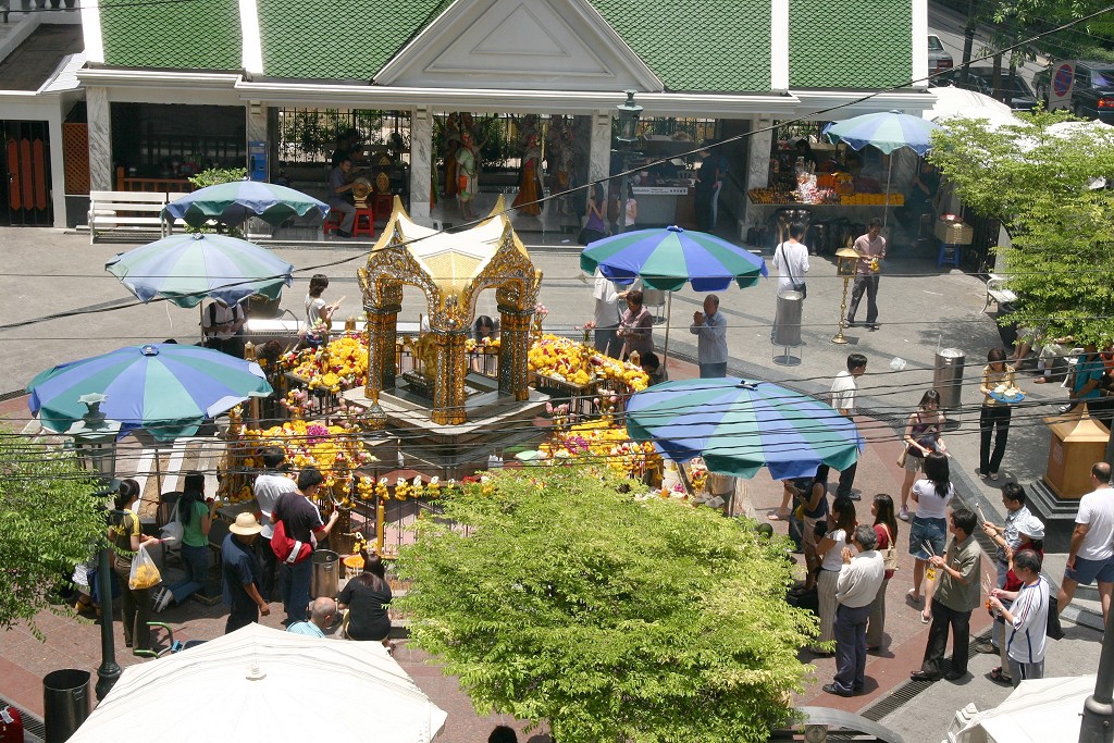 Blick auf den Erawan-Schrein vom Zugang zum Skytrain