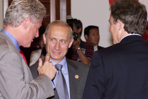 Archivfoto: Russlands Präsident Wladimir Putin und sein US-Amtskollege Bill Clinton beim G8-Gipfel in Okinawa, Japan, am 22. Juli 2000.