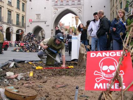 Zak Johnson, Kampfmittelexperte von Handicap International, demonstriert auf einem nachempfundenen Minenfeld auf dem Münchner Karlsplatz die gefährliche und aufwändige Räumung von Minen und Streubomben. Im Hintergrund die Schuhpyramide als Mahnmal für die Opfer dieser explosiven Kriegsreste. © Olaf Abel für Handicap International