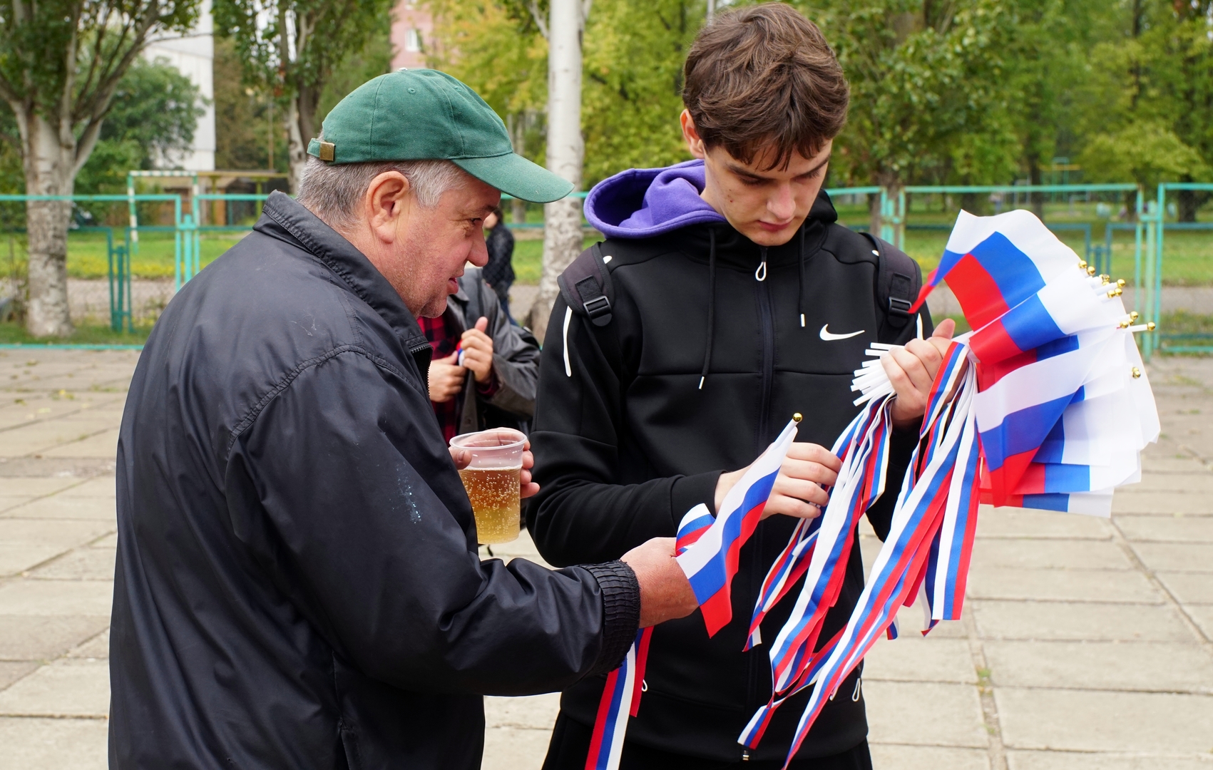 Ein junger Mann verteilt russische Flaggen vor einem Wahllokal in Cherson, wo ein Referendum über den Beitritt zu Russland abgehalten wird, 27. September 2022. Bild: IWAN RODIONOW / Sputnik