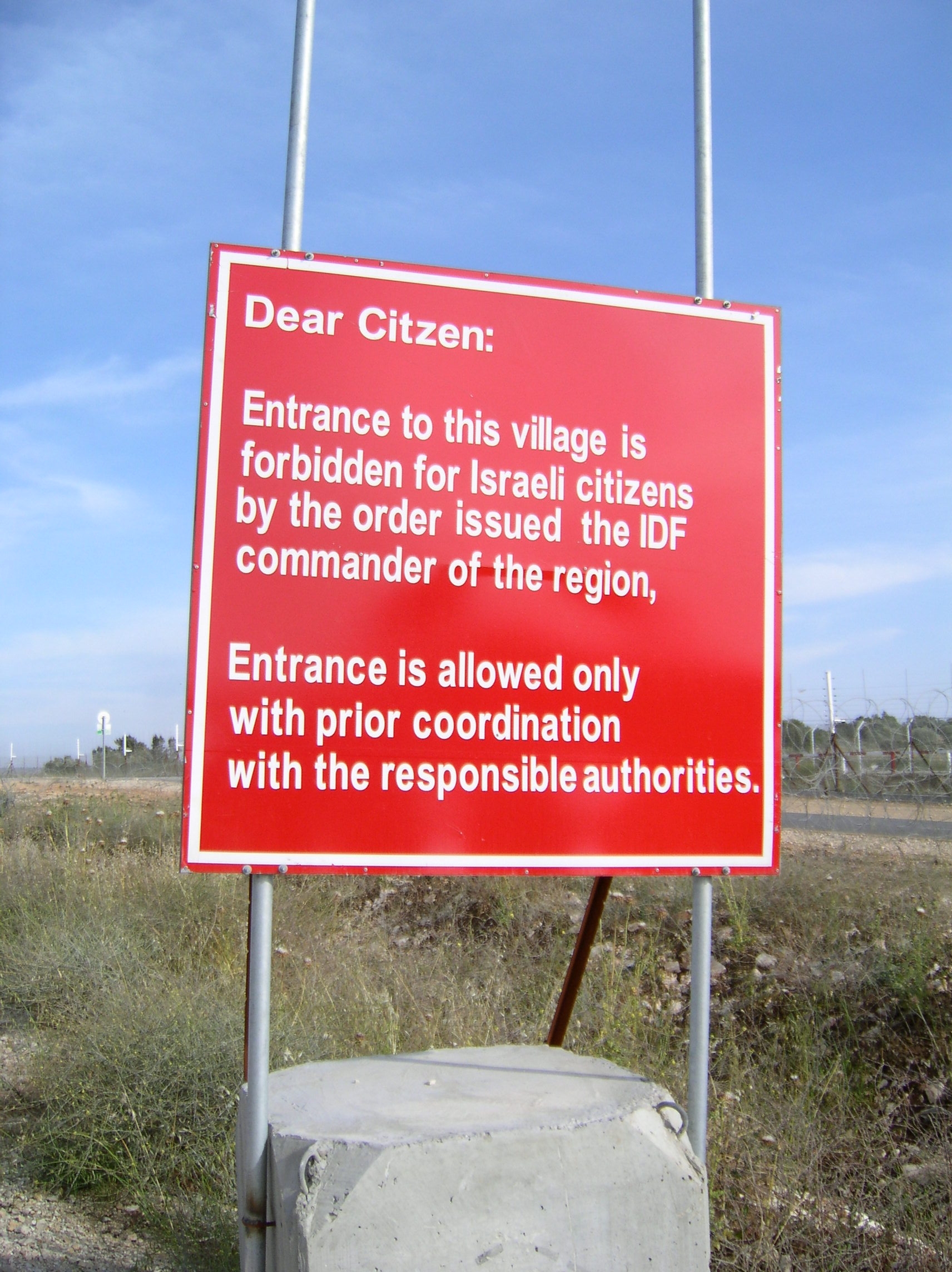 Zutrittsverbot der IDF für israelische Bürger zu einem Ort in den Autonomiegebieten (2004). Bild: Feliks (german/english Wikipedia)