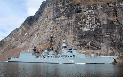 Der Marinemaler Olaf Rahardt an Bord der Fregatte F213 AUGSBURG. Die Fregatte im Geirangerfjord in Norwegen.
