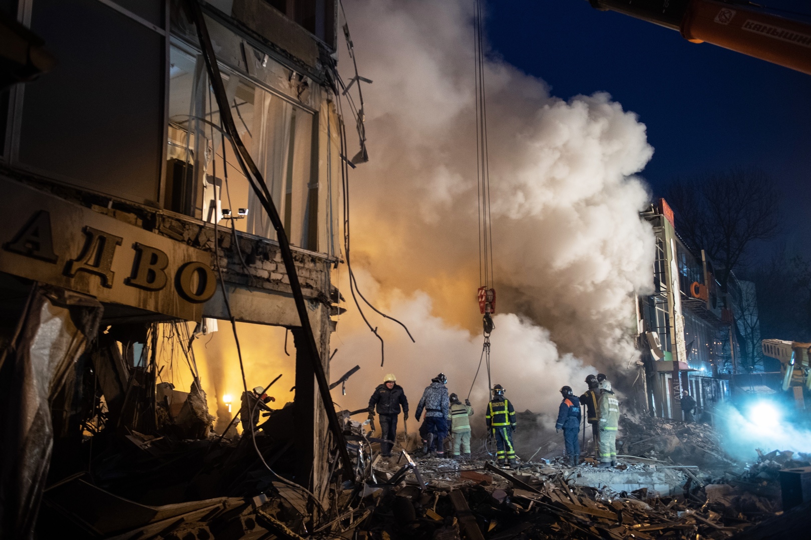 Rettungskräfte nahe eines Einkaufszentrums im Donezker Stadtbezirk Kalininski, das durch den Beschuss der ukrainischen Streitkräfte zerstört wurde, 16. Januar 2023 Bild: Waleri Melnikow / Sputnik