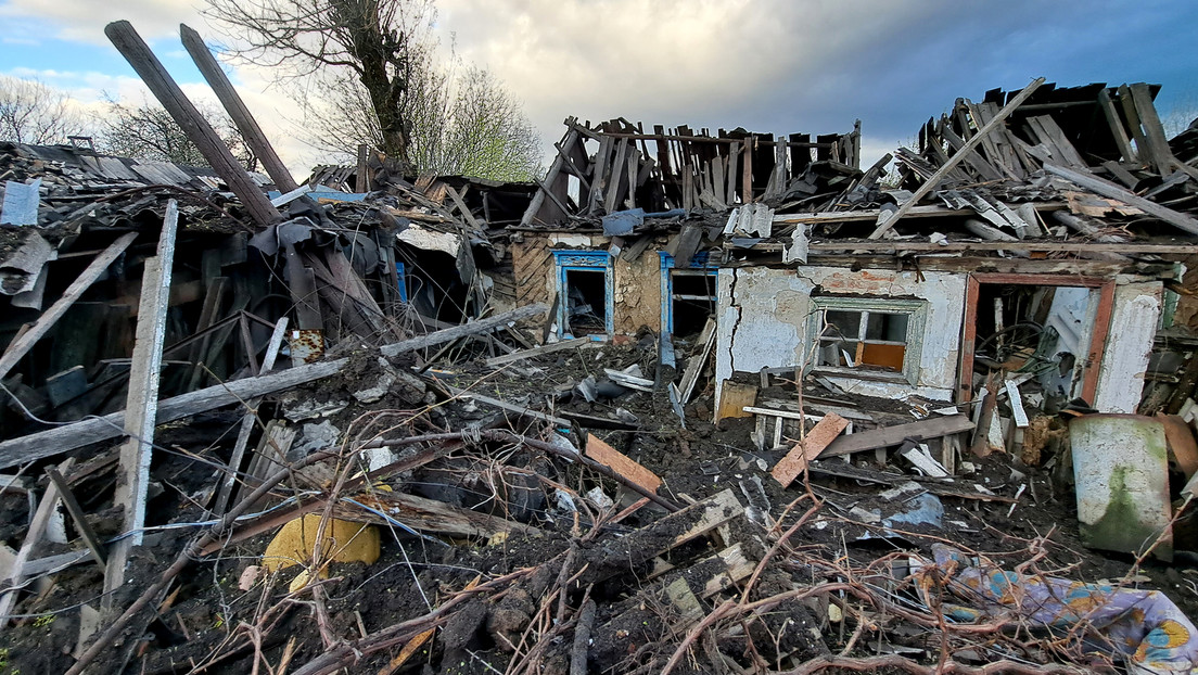 Archivbild: Ein durch ukrainischen Beschuss zerstörtes Wohnhaus im Donezker Bezirk Kiewski Bild: Sergei Baturin / Sputnik