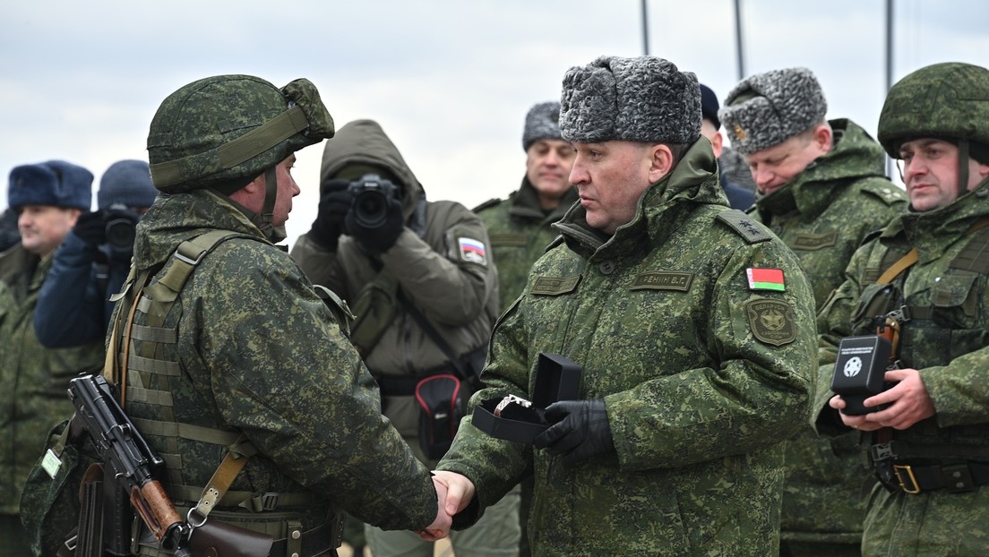 Weißrussisches Verteidigungsministerium: Streitkräfte führen unangekündigte Inspektionsübung durch (Archivbild: Weißrusslands Verteidigungsminister Viktor Chrenin (Mitte) bei gemeinsamer russisch-weißrussischeR Übung "Entschlossenheit Verbündeter-2022" auf dem Gelände Obus-Lesnowski, Region Brest.)