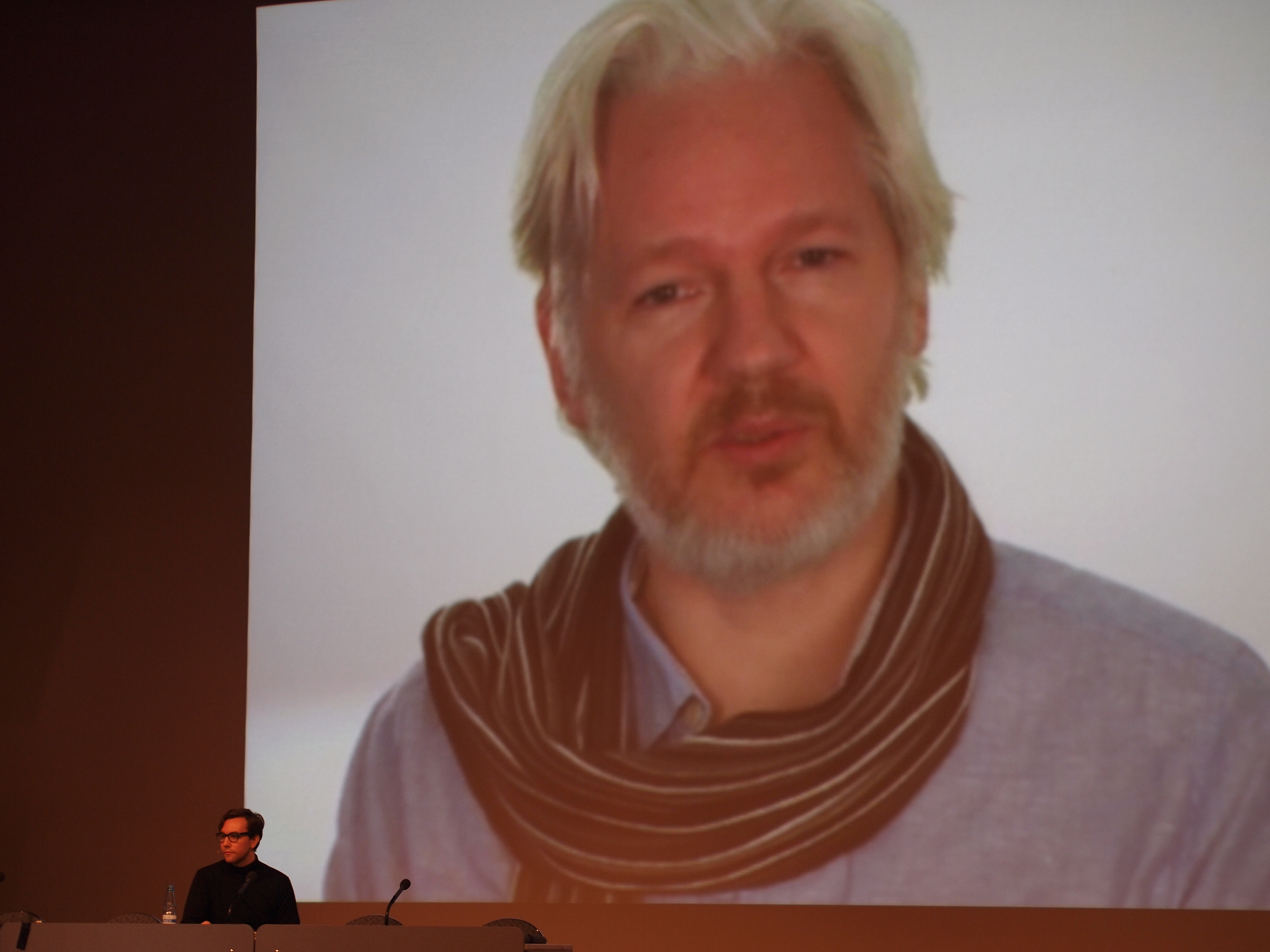 Jacob Appelbaum mit dem via Skype zugeschalteten Julian Assange auf dem 30C3 im Dezember 2013