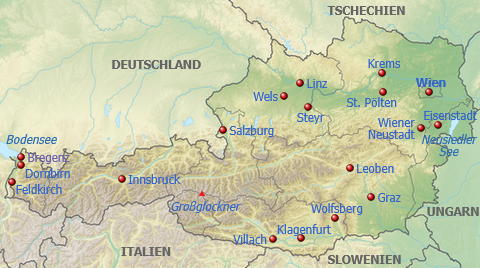 Karte der 17 Oberzentren (Zentrale Orte) in Österreich