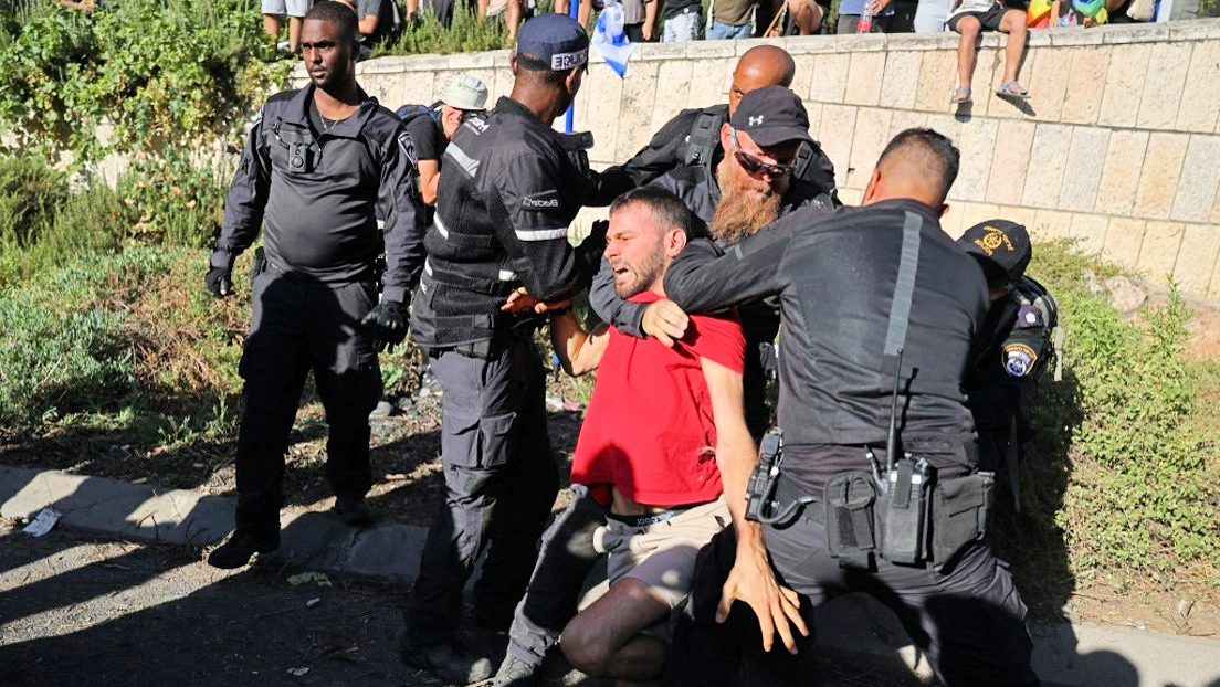 Israelische Sicherheitskräfte nehmen am 24. Juli 2023 in Jerusalem einen Demonstranten in der Nähe der Knesset, des israelischen Parlaments, fest.