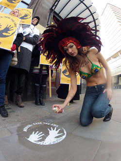Eine Frau in einem brasilianischen Karnevalskostüm überbrachte die klare Botschaft an Brasilien, 'die Awá zu retten'. Bild: © Survival