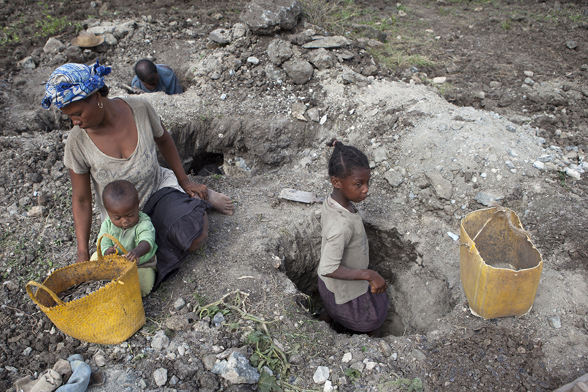Mamisoa (10, rechts) arbeitet in der Mika-Mine Tsivery nahe dem Dorf Ampikazo; links ihre Mutter und ihre kleine Schwester. 11.000 Kinder wie sie schürfen Mika für Elektrogeräte und Autolacke.
