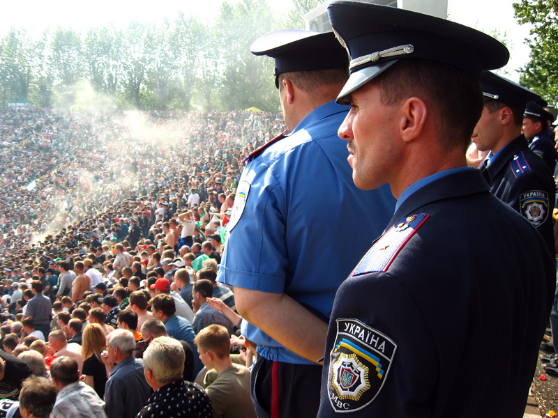 Ukrainische Milizionäre (Polizei) während eines Fußballspiels