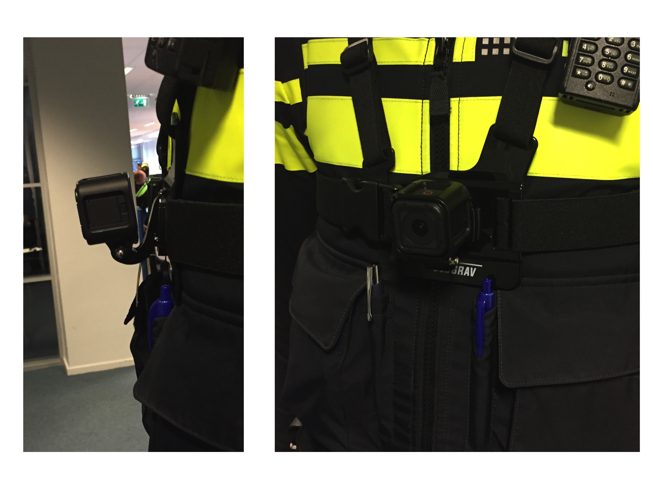 Body-Cam (GoPro) an der Hüfte eines Polizeibeamten in Utrecht (Niederlande)