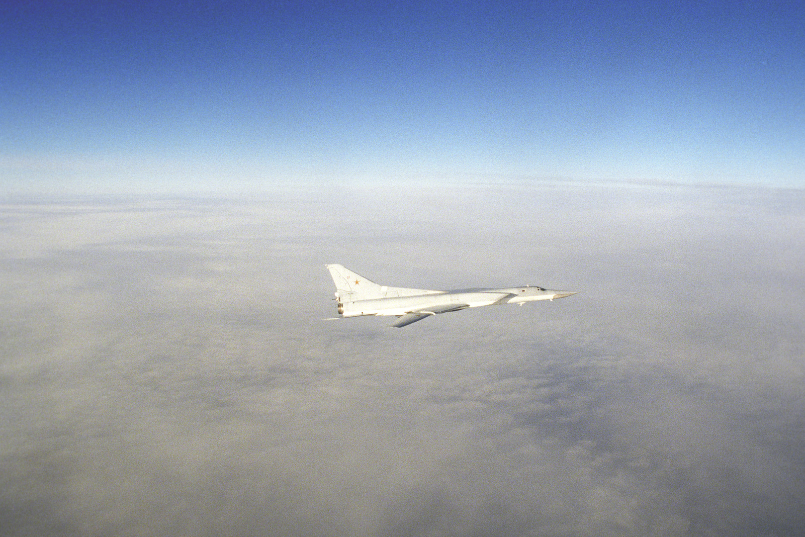 Archivbild: Ein russischer Bomber vom Typ Tu-22M3 mit einem Marschflugkörper vom Typ Ch-22, 1. März 1996 Bild: OLEG LASTOTSCHKIN / Sputnik