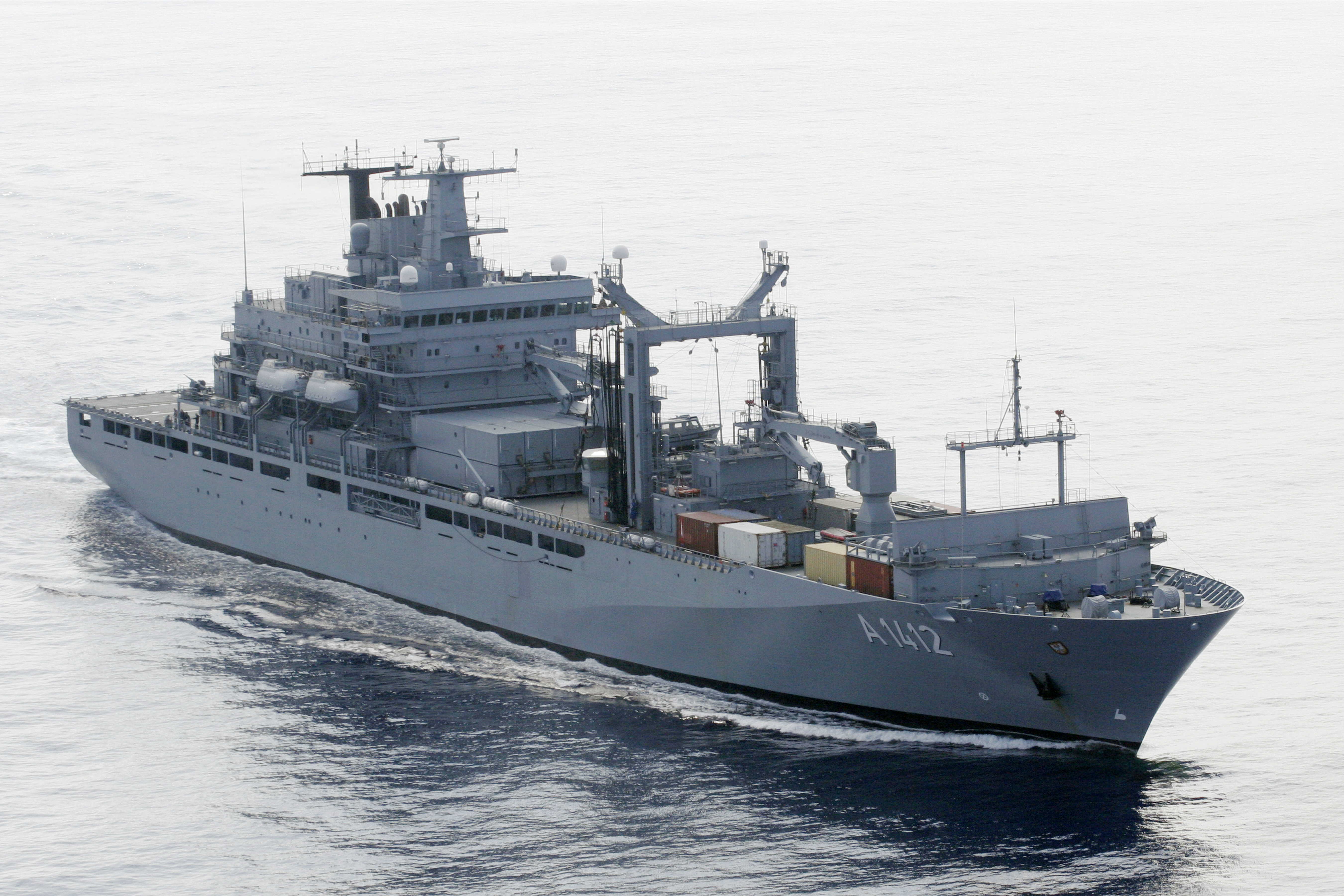 Die Einheiten sind auf dem Weg in den Hafen von Limassol um nach dem 14 tägigen Transit Versorgungsg¸ter wie Lebensmittel und Kraftstoff aufzunehmen. Hier zu sehen der Einsatzgruppenversorger FRANKFURT AM MAIN in See.