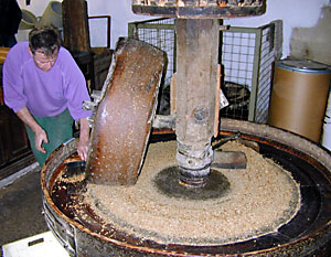Quetschen von Walnüssen im Kollergang (Ölmühle)