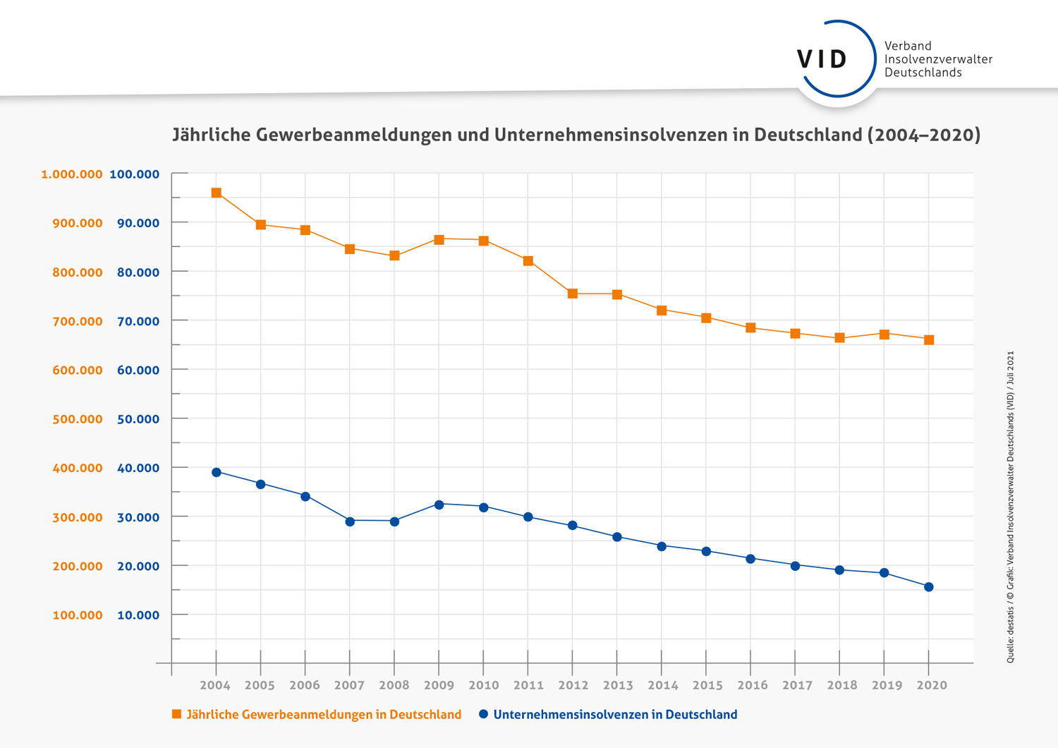 Jährliche Gewerbeanmeldungen und Unternehmensinsolvenzen in Deutschland (2004-2020)